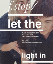 f.stop / let the light in is Alias Dance Project's next full evening of remounted and original works, featuring the premiere of 2 works by Francesca Chudnoff, 1 by Lauren Cook, and a remount co-choreographed by Lauren Cook and Troy Feldman.