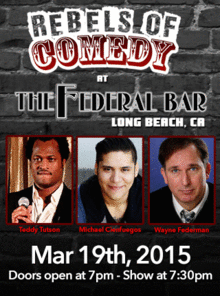 It's Rebels of Comedy at the Federal Bar in Long Beach. Come out and see a night of live comedy, featuring an awesome lineup of professional features and headliner comedians. Hosted by Teddy Tutson, with the show's headliners : Michael Cienfuegos, Wayne Federman.