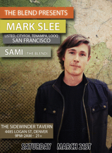 Many of you are familiar with Mark Slee, for those of you who may not be, please check out his bio and Soundcloud link below. We are looking forward to creating another special night at the Blend, and hope you will help us welcome Mark to Denver with your creative spirit and fun dancefloor energy!