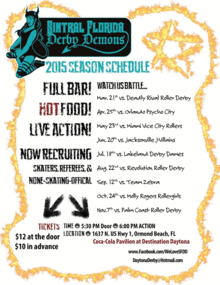 Indulge and take the plunge, come cheer on your local Sintral Florida Derby Demons as they take on Pinellas & Pasco County's very own Revolution Roller Derby! Spectate as the mash-up between skaters agility, strength, and strategic action careen on the track the unthinkable will unfold don't miss out on this competitive sport!!! Watch this fast passed dynamic contact sport under the Coca-Cola Pavilion at Destination Daytona, just west off of Florida's 95 exit 273.