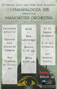 CU Denver Live! presents Lynxapalooza 2015 featuring Manchester Orchestra and New Leverage. CU Denver's welcome back concert is hosted on Auraria Campus (Spruce lot) but is open to the general public.