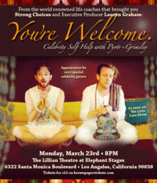 The World-Renowned Life Coaches that brought you "STRONG CHOICES" and Executive Producer LAUREN GRAHAM bring you the soul-shifting, heart-jostling ONE NIGHT SHOW-MINAR entitled YOU'RE WELCOME. Celebrity Guests, Pillows, Music, Throbbing, Blessons (Blessings+ Lessons), Revolution and Important Personages will be involved. YES: Donation Wines and Hummuses. NO: victims. YES: Your mind blown-out. NO: refunds.