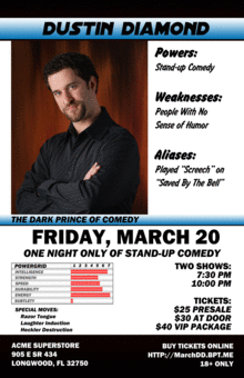 An uproariously funny comedian, Dustin Diamond is famous for his zany, high-energy performances. Dustin became internationally known as the humorous "Screech" character on NBC's Saved by the Bell. Dustin is not only one of the most recognizable faces in show business, but a standout in today's comedy world.