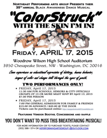"ColorStruck: With the Skin I'm In!" is a thought provoking dance musical wrapped in the effervescence and energy of the electrifying Northeast Performing Arts Group. This production will explore an educational expression of history, human behavior, and images of color and change. See how today's youth overcome the destructive forces of color bias and create hope for embracing humanity. Inspiring Change YES WE CAN!