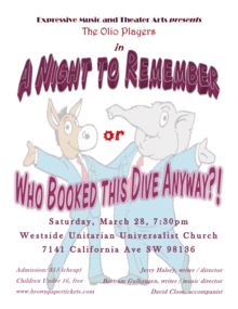 Expressive Music and Theater Arts presents "A Night to Remember" or Who Booked this Dive Anyway?!" Those zany Olio Players are back with another silly..er, amusing musical that's guaranteed to entertain. Great songs, great shtick, great fun, thick plot. Get your tickets now because it's sure to be SRO.