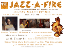 Dear Friends, We invite you to join us and dance the March blues away with a hot session of Jazz-A-F!RE, Sunday, March 29, 2015 from 3:00 - 5:00 pm in Memphis Sounds, located at 22 North Third Street, downstairs from the EconoLodge Hotel. For the stair-challenged there is a ramp off the parking garage north entrance on Court Street. You will experience the finest in straight-ahead jazz music hosted by the Memphis Black Arts Alliance's FireHouse Community Arts Center while you enjoy bar & food service from Memphis Sounds Grill. This month's Jazz-A-F!RE will be hosted by the incomparable Cequita "Monique" McKinney and will feature FireHouse Academy professional music faculty Lance Thompson (guitar) and Kent Suggs (bass), as well as members of the Prime Cut Band Audie Smith (piano) and Andre' Holman (drums). Amateur and professional jazz musicians and singers are invited to BYOI (Bring Your Own Instrument) and sit in and jam with the musicians during the final hour. Admission is a mere $12.00 at the door, and advance tickets are discounted to $10.00 at Brown Paper Tickets. For more information call 901-948-9522 or email mbaafirehouse@gmail.com. We hope to see you there!