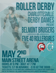 Come Cheer on the Charlottesville Derby Dames Belmont Bruisers as they battle the 540 Rollergirls May 2, 2015 at the Main Street Arena!
