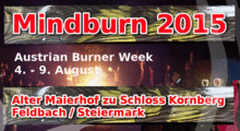 Mindburn is the Austrian burner week, a time of art, workshops, music, discussion, games, performances, fun, and everything you can imagine, created by the participants, that is YOU! Mindburn 2015 will take place on 4-9 August in the area of Kornberg castle, close to Feldbach in the Austrian region of Styria.