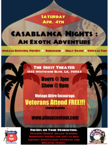 Held Saturday April 4th, 2015 at 7:00pm at the Crest Theater in Westwood, CA "Casablanca Nights" is a trip back in time. Inspired by the classic film, "Casablanca", the night will include classic burlesque inspired by far away lands, belly dancing beauties and our regular crew of morale boosting Pin-Ups. Proceeds from the event go to benefit Award-Winning nonprofit Pin-Ups for Vets to help Support Hospitalized Veterans and Deployed Troops.