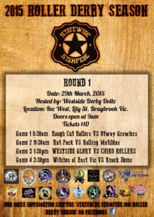 9:30am Rough Cut Rollers V Otway Growlers 11:30am Rat Pack V Roller Matildas 1:30pm WestSide Glory V Chiko Rollers 3:30pm Witches of East Vic VS Knock Hems