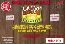 Country Time Comedy is a monthly comedy show snuggled in the heart of a quaint little BBQ restaurant in Union Square. It features the best comedians in all of NYC/the world, and it only costs $5! There is a full service waitress, and drink specials include $3 bud/bud lights. It is always fun, always hilarious, and most importantly, it is always full of tremendous people. Here's this show's lineup. It's ridiculous, in the best way possible...