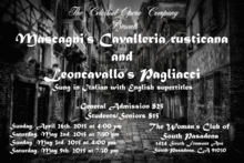 The Celestial Opera Company, founded in 1998, is proud to announce its upcoming production of the double-bill of two one-act operas, Mascagni's Cavalleria rusticana and Leoncavallo's Pagliacci! Often paired together, the operas are two of the most famous examples of Verismo (a post-Romantic operatic tradition that expounds Italian country life). The operas will be fully staged, costumed, and feature a small orchestral ensemble. The operas will be sung in Italian with supertitles in English. The performances will feature a pre-opera talk one hour before curtain time. All performances will be held at The Woman's Club of South Pasadena, 1424 Fremont Ave, South Pasadena, CA 91030.