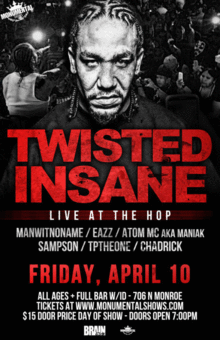 Outside of little bits of information picked from the internet, not much is known about Twisted Insane other than the fact that he has one of the hardest, fastest flows in the history of hip-hop. Twisted Insane started out his career homeless selling cd's just to get money for food and a room. Eventually, Twisted Insane's buzz grew into something out of control. Fans became more than fans, they became something of a cult. Not "just another rapper" Twisted Insane is the future and apparently those who set the standards agree. Twisted Insane's flow and rhymes are so brutal and high-speed in addition to often being one of the fans two most common choices for fastest rapper on the planet, that Tech N9ne (the other common choice among fans for the title of 'the fastest'), the #1 independent artist in the world recently tapped Twisted Insane for an appearance on Tech N9ne's latest album, the #4 Billboard charting "All 6's And 7's" on the the song "Worldwide Choppers". The worldwide recognition has only intensified the heat surrounding Twisted Insane and with the release of his new video, "Kick Rocks" from his forthcoming album, "The Root Of All Evil", Twisted Insane is set to blast off into the stratosphere.