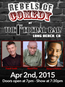 It's Rebels of Comedy at the Federal Bar in Long Beach. Come out and see a night of live comedy, featuring an awesome lineup of professional features and headliner comedians. Hosted by Frazer Smith, with the show's headliners : Rawle Dee, Dwayne Perkins.