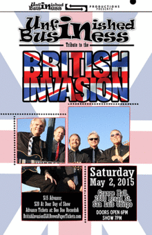 This British Invasion Show featuring Unfinished Business is a tribute to the great British rock and roll bands that "invaded" America starting with the first appearance of The Beatles on the Ed Sullivan Show in 1964. The Beatles were followed by The Dave Clark Five, The Rolling Stones, Gerry and The Pacemakers, The Animals, The Zombies, The Animals, Them, The Yardbirds, The Who, The Kinks, The Hollies, Procol Harum, The Moody Blues, Van Morrison, Deep Purple, and many more. The "invasion" was phenomenon that changed American music and culture forever. This will be a dance/concert, and dressing in the style of the '60s is encouraged.