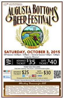 Augusta Bottoms Beer Fest is an annual fund raiser for local a non-for-profit organization that helps and assists families in the greater St. Louis area that have children fighting disablities. The event raises much need money to help these families through their rough times. We average 37+ independent brewers from around the greater St Louis area. The annual Augusta Bottoms Bier Fest is a one day, 5 hour event.
