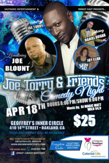 Oakland get ready April 18th at Geoffrey's Inner Circle Joe Torry & Friends featuring Daniel Catrell Dugar, headlining Joe Blount with special guest Joy Elán Sledge. This is an Eastwind Entertainment & Ernest East Production in Association with Rick Sullivan. Tickets at the door will be $25.00. Event starts at 9:00 PM/ Doors open at 8:00 PM.