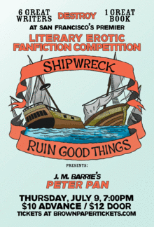 Fics are blind-read by our Thespian-in-Residence, Baruch Porras-Hernandez, and you choose the best ship before the writers are unmasked. The winner is cast off from polite society, and invited back the next month to defend their title. Critics are saying: "...punny sodomy, and gross indecency." "... the most despicable literary event possible." "... an affront to literature." "It used to be we had to sit in dark, sticky booths to get these kinds of sleazy thrills." "Come if you are high on marijuana cigarettes and have done sex before." "... a vile, disgusting event." "Shipwreck will bring you to madness, and you may never return." "...wonderfully, masterfully, hilariously disgusting." $10 advance tickets / $12 at the door. Ticket includes open bar for 21+.