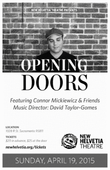 Before setting out on its next adventure, New Helvetia Theatre presents a one night only cabaret featuring founding artistic director, Connor Mickiewicz, and some of his NHT friends. For the last three years, the company has called 1028 R Street home, but it is time to move on and explore deeper into the heart of Sacramento and its place in the community. Told through song and anecdotes, Mickiewicz has created a musical collage reflecting his hopes and dreams while tackling personal disappointments and occasional disillusions along the way. Hopefully humorous, human, and brutally honest, the evening is a celebration of surrender and the joys it can bring. Selections include works by Stephen Sondheim, Adam Guettel, Jacques Brel, Stew and others as well as pieces from the next generation of writers.