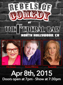 It's Rebels of Comedy at the Federal Bar in North Hollywood. Come out and see a night of live comedy, featuring an awesome lineup of professional features and headliner comedians. With the show's headliners : Ella James, Hunter Canedy, Paula Bel
