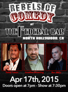 It's Rebels of Comedy at the Federal Bar in North Hollywood. Come out and see a night of live comedy, featuring an awesome lineup of professional features and headliner comedians. Hosted by Teddy Tutson, with the show's headliners : Jonathan Browning, Rev. Mitcz