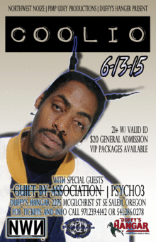 This is going to be a night to remember.. Duffy's Hangar, NorthWest Noize, and Pimp Udey Productions have teamed up to bring hip hop royalty to the capital city. Coolio will be performing all his hit songs including Grammy award winning single "Gangsta's Paradise", as well as "Fantastic Voyage", "C U When U Get There", and "1, 2, 3, 4 (Sumpin' New)". Tickets are $25 in advance $35 at the door and $75 for a VIP dinner package. Also performing live are Guilt By Association, Psycho3, and more...