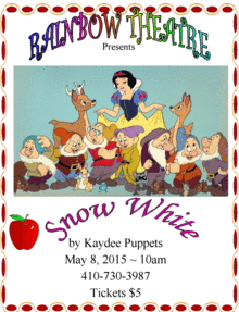 Rainbow Theatre at Slayton House will continue this season's series with the ever popular Kaydee Puppets performing "Snow White" on Friday, May 8, 2015, Kaydee Puppets uses large, delightful moving mouth puppets, guaranteed to appeal to children 2 and above. Each performance is especially designed in both puppets and script to create a fun "now" approach to the fantasy world of fairy tales. The puppet show is at 10:00am in the Slayton House Theatre in the Village of Wilde Lake in Columbia. Tickets may be purchased in advance for $5 each and may be available at the door. Credit cards may be used at BrownPaperTickets.com, keyword Rainbow Theatre, no reservations, no refunds. Group rates. For information call 410-730-3987. Sponsored by Wilde Lake Community Association. For a copy of this season's brochure email events@wildelake.org.