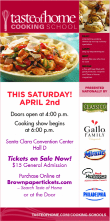 Bay Area News Group brings you Taste of Home Cooking School and Expo! On April 2, 2011 at the Santa Clara Convention Center you can join us for this exciting event! In addition to the 2 hour cooking school taught by a professional cook from Taste of Home Magazine, you will have the opportunity to check out local businesses whose products and services are geared toward attendees interested in improving their life and home.