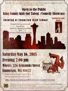 This show is an event to showcase talented kids in our county. This show is being put on by the members of King County 4H Performing Arts Club, but the performers are from all over King County including some talented kids right here in good old Enumclaw, WA. We need your help as the audience is the judge for the acts... Prizes will be awarded after intermission and those kids will be allowed to perform at the King County Fair on July 17th.