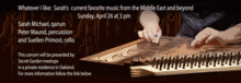 A qanun recital by Sarah Michael, with Peter Maund, percussion and Suellen Primost, cello. A selection of Arabic, Turkish, Armenian and other pieces played on the qanun, the Middle Eastern zither. From lively dance tunes to modal improvisations, Cuban standards to Medieval saltarellos, Sarah will play her current favorite tunes, accompanied by the astonishing drumming of Peter Maund and the elegant and inventive cello of Suellen Primost.