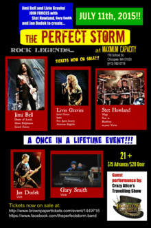 CHECK THIS OUT!!! JIMI BELL AND LIVIO GRAVINI WILL BE "JOINING FORCES" WITH STET HOWLAND, JAN DUDEK, AND GARY SMITH TO CREATE THE "PERFECT STORM"! LIVIO GRAVINI (LEAD SINGER)~ JOINED FORCES, JUSTIN, AMERICAN ZEPPELIN, THE FREE SPIRIT SOCIETY! JIMI BELL(LEAD GUITARIST)~HOUSE OF LORDS, JOINED FORCES, MAXX EXPLOSSION! STET HOWLAND(DRUMS)~WASP, RUN 21, BLACKFOOT, 10,000 VIEWS JAN DUDEK(BASS)~VICE! GARY SMITH(KEYBOARDS)~VICE! A "ONE TIME ONLY" CONCERT THAT WILL BLOW YOUR MINDS!!! JULY 11th AT MAXIMUM CAPACITY IN CHICOPEE, MA!!! SAVE THE DATE... THIS IS GONNA BE THROUGH THE ROOF!!!