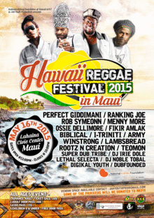 - 2015 REGGAE ARTIST LINE UP - Perfect Giddimani - St.Ann Jamaica RANKING JOE - Jamaica Rob Symeonn - New York Army - V.I "Virgin Islands" Menny More - Jamaica Biblical - California Fikir Amlak - Puerto Rico the Lambsbread - Hawaii I-Triniti - California Dubfounded -Maui Teomon -Maui Rootz N Creation -Maui Digikal Youth - Maui Super Dub Tribe- Maui Led Dread - Chicago MORE ARTIST TO BE ANNOUNCED ........