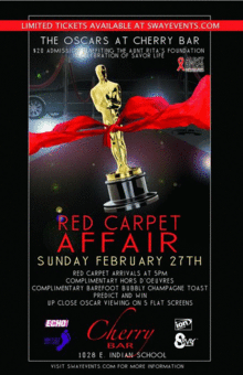 With purchase of your ticket, guests will enjoy a walk down the Red Carpet with Paparazzi snapping shots, a Champagne Toast of Barefoot Bubbly, hors d' oeuvres, Predict & Win for Fabulous Prizes worthy of the Red Carpet, and an up-close Oscar viewing on 5 huge flat screens and one gigantic projection screen, enabling every guest with prime seating.