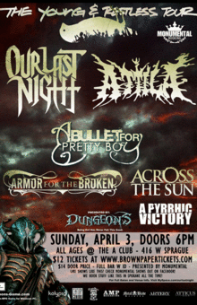 Our Last Night, Attila, A Bullet For Pretty Boy, Armor For The Broken & Across The Sun rock an all ages show at The A Club in beautiful downtown Spokane on The Young & The Restless Tour. buy tickets in advance, this might sell out!