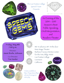 "Speech Gems" is the Las Positas College Speech Team's showcase of presentations and performances that the team members have competed with at local, national, and international tournaments. The presentations you'll be seeing will inform you, make you laugh, touch you, and amaze you! Directed by Janet Brehe Johnson and Tim Heisler, the Team took community college sweepstakes awards at both their national and international competitions. The presentations include public speaking, oral interpretation of literature, and a readers theater performance of "The Splendid Stones," a 25-minute show with compiled literature about gemstones and the impact they have on our lives. The evening's performers will be team members Katie Lai, Trevor March, Jacob Montez, and Jessica Samorano, with Kyra Tillmans and Rajiv Vijayakumar as hosts. All performances are highly polished and a joy to watch. Join us for a fun evening of live entertainment!