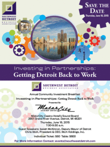 Please join the Southwest Detroit Business Association (SDBA) for the 2015 Community Investment Breakfast (CIB). The CIB is the SDBA's largest fundraiser. Produced with the use of local Detroit vendors, the theme of this year's breakfast Investing in Partnerships: Getting Detroit Back to Work, is sure to stimulate great conversation among our Panelists, Isaiah McKinnon, Deputy Mayor of Detroit and Chris Ilitch, President & CEO, Ilitch Holdings, Inc.