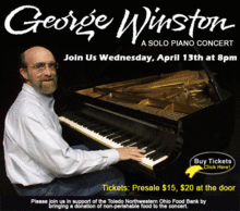 Solo pianist George Winston, best known for his seasonally themed recordings including DECEMBER, AUTUMN, WINTER INTO SPRING, and SUMMER, presents a solo piano concert. This solo piano concert will feature selections from George's melodic piano recordings, as well as R&B piano, stride piano, Vince Guaraldi's Peanuts© pieces, and more. George will also play some Hawaiian Slack Key guitar. There will also be a food drive at the concert in support of the Toledo Northwestern Ohio Food Bank. We would like to encourage audience members to bring a non-perishable donation to the concert. In 1972 George recorded his first solo piano album, BALLADS AND BLUES 1972. Since 1980 George has released nine more solo piano albums: AUTUMN (1980), WINTER INTO SPRING (1982), DECEMBER (1982), SUMMER (1991), FOREST (1994), LINUS & LUCY-THE MUSIC OF VINCE GUARALDI (1996 - which features compositions by the late jazz pianist, including Cast Your Fate to the Wind and pieces from the Peanuts TV specials); PLAINS (1999 - which was inspired by his Eastern Montana upbringing), NIGHT DIVIDES THE DAY - THE MUSIC OF THE DOORS (2002), MONTANA A LOVE STORY (2004) and GULF COAST BLUES & IMPRESSIONS A HURRICANE RELIEF BENEFIT (2006). His latest release is LOVE WILL COME - THE MUSIC OF VINCE GUARALDI, VOL. 2 (2010).
