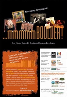 This special evening of everything local will combine short films by Boulder County filmmakers, interspersed with live music from the Lisa Bell Band and Strangebyrds (Cari Minor & Ray Smith), one-of-a-kind art by Annette Coleman & Carlentini Jewelry, and local food & beverages available for sale in the lobby prior to the show and during intermission: wood-fired pizzas by Laudisio; fresh-popped gourmet Boulder Popcorn; beverages by Boulder Creek Winery, Boulder Beer, New Planet Gluten Free Beer, and Eldorado Natural Spring Water; desserts by Shamane's Bake Shoppe.