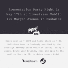 Presentation Party Night is a monthly lecture series based in Bushwick, Brooklyn, and founded on the idea that everyone has something to teach. Our goal was to create a forum for learning and progressive discussion in our community, but to make it free and fun. PPN combines a party atmosphere with informational programming to make a raucous celebration of peer education, food, and beer. Our events happen on the 3rd Sunday of every month. Everything is totally free and open to the public - we provide beer and food (potluck style - bring something to share) and we survive on donations from the audience.