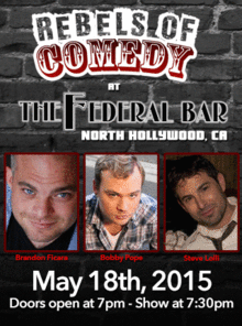It's Rebels of Comedy at the Federal Bar in North Hollywood. Come out and see a night of live comedy, featuring an awesome lineup of professional features and headliner comedians. Featuring : Brandon Ficara, Bobby Pope, and Steve Lolli.