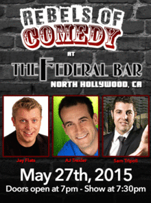 It's Rebels of Comedy at the Federal Bar in North Hollywood. Come out and see a night of live comedy, featuring an awesome lineup of professional features and headliner comedians. Hosted by Jay Flats, with headliners : AJ Trexler, Sam Tripoli