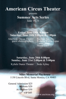 American Circus Theater presents its Summer Arts Series June 19th, 20th and 21st. Join us for an evening of song, dance, and acrobatics. All ages welcome. Program A American Circus Theater Friday 8pm Saturday 2pm, 5pm