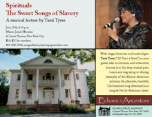 Out of bondage came one of America's great folk arts -- the spiritual. On June 25th, at 7 p.m., historian, actress and recording artist Tami Tyree (recently heard on the soundtrack of the Oscar-winning film "12 Years a Slave") will deliver a "musical lecture" exploring the history and sounds of early African-American religious song. Using recordings, live performances and sing-alongs, Tami will take attendees on an intimate, and interactive, journey into the deep musical past, conveying in word and song the social and religious underpinnings of the spiritual as well as its foundational relationship to generations of American popular song.