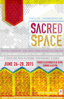 Sacred Space is a collaboration between The Exchange Artists and musician/composer Allyson Lipkin (aka DD Dagger). It is a multi-media theatrical movement piece, a sound experience, and a visual interaction for the public. The concept originated from observations of sacred spaces throughout history, and the pilgrims who continue to travel and seek the potentially transcendent experiences of witnessing such places. Sacred Space ponders the earliest human questions of existence and purpose. This devised performance brings together an ageless tale, an original score, movement, theatricality, and Austin architecture.