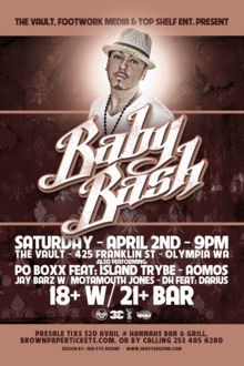 The Vault Nightclub / Footwork Media / TopShelf Ent present BABY BASH LIVE Saturday.April.02nd.9PM featuring PO BOXX | AOMOS | JAY BARZ | MOTAMOUTH JONES | DH w DARIUS ======================== THIS IS A 18+/21+ EVENT ========================