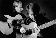 Their space is made of strings acoustic strings. Strings have their own kind of chemistry, and steel and nylon played together have their own subtle dynamic and exchange. They talk back and forth, like old friends who don't get together as often as they'd like to. Something original is going on. Part of it is the mix of strings themselves - one guitar strung with steel, another strung with nylon. We seldom hear this. Ben Verdery says that he tried it once before, in a couple of tunes recorded years back with Leo Kottke. It makes a very pleasing mix of textures, like silk laid next to satin. One helps to define the other. But the more important chemistry is what the performers release in one another as they play. Bill Coulter and Ben Verdery have found a unique and energizing partnership. They first met back in 1984, when Ben was on a west coast tour and performing at the University of California, Santa Cruz. Bill, who had recently moved to the region, saw it announced in the local paper. At the time he didn't know much about Ben Verdery. "The concert just sounded interesting," he said. "So I went, and with the first piece I fell in love with this guy's music." Afterward he introduced himself, they started talking and quickly found that they had a lot in common. Ben needed a ride down the hill to his hotel. They had a few beers and kept talking two young guys who shared a passion for the guitar. Though they lived on opposite sides of the continent, they stayed in touch and performed together for the first time in 1990. Bill had been exploring Celtic music and was putting an album together. He invited Ben to join him on one of the tunes. Three years later they teamed up for two more tunes on another of Coulter's CD's, and afterward started talking, in a general way, about doing more together. It had become a musical relationship they both savor, easy and fluid, with lots of agreement on how arrangements should go and how best to manage such matters as intonation and improvisation, to release the instrument's full range of feeling. While listening to Bill & Ben's recordings (Song for our Ancestors and Happy Here) one will note that most of the tunes have been around for a while, some for centuries. There are family lines, and there are musical lines. Many ancestries and influences converge in these recordings from Ireland, Germany, France, Spain, Africa, and Tibet, together with works written by Bill, Ben, Bach, Lennon and Bruce. What we get from Bill & Ben is a guitar performance at its most intimate. There is heart here and a meditative quality. Each musician goes inward to his still center, in order to come outward with a shared sound that is masterful yet vulnerable.