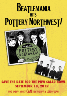 Did you know that the Beatles came to Seattle in 1966 so they could play the opening ceremony of Pottery Northwest? It's true, we swear! In anticipation of the 50th anniversary of this historic event, we've decided to give our 2015 Salad Bowl a Beatles theme. Beatles music, bowls with illustrations of Beatles songs, mop-tops, Beatles salad, you name it! We've enlisted the residents to conjure spirits and bring the band back together for one final performance. Not to be missed! Funds raised during Salad Bowl support a wide variety of free events through the year such as our exhibitions and lecture series. The Salad Bowl has also allowed us to eliminate studio fees and offer a materials and firing stipend to our residents. This year we'll be making a big push for the Wally Fund to support our resident artist project grant in perpetuity. A ticket gets you in the door and allows you to choose from over 300 bowls that are hand-made and hand painted by our resident artists. We'll also provide a scrumptious array of dinner salads to fill that bowl. As the evening begins you'll have the chance to bid on beautiful art work in our silent auction or purchase work from our resident's gallery. After dinner we will have a live auction that will include platters painted by Northwest artists from the ceramic field and beyond. We'll also be selling tickets to a raffle for a $250 PNW credit and a sunset happy hour cruise on the famous yacht, Slo Dance.