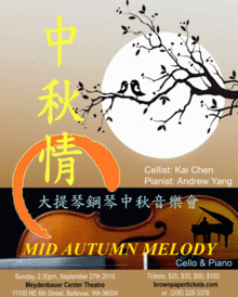 Renowned cellist Kai Chen, former Principal Cellist of China National Opera Symphony Orchestra, and talented young pianist Andrew Yang will bring world famous classical repertoires and Chinese music to celebrate Chinese Moon Festival!