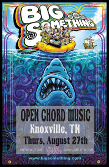 BIG Something: With a powerful sound that is both refreshingly original and yet classic in its approach, BIG Something fuses elements of rock, pop, funk, hip hop and improv, in order to take listeners on a journey through a myriad of musical styles. Formed in 2009, Big Something is one of the most exciting new rock bands to emerge from the southeast. The band features Nick MacDaniels (guitars, vocals), Doug Marshall (bass), Josh Kagel (keys, synth, trumpet), Casey Cranford (sax, EWI), Jesse Hensley (lead guitar), and Ben Vinograd (drums).
