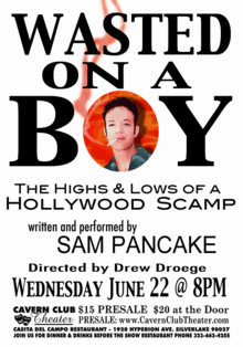 "When I was a little boy in West Virginia, spinster great aunts and old ladies and such would clock my big blue eyes, wavy locks and curly lashes and exclaim, 'Wasted on a boy!' I, knowing and relishing my true nature, would smirk and think to myself, 'Not wasted on THIS boy!'" Join actor and comedian Sam Pancake as re-traces his journey through show-biz, from being "forced" as a child to do drag in a Minstrel Show in Appalachia to being labeled "Hollywood's Go-To-Gay Guy" by Advocate Magazine in 2010. Stories will be told, mud will be flung, names will be named. Drink up and enjoy!